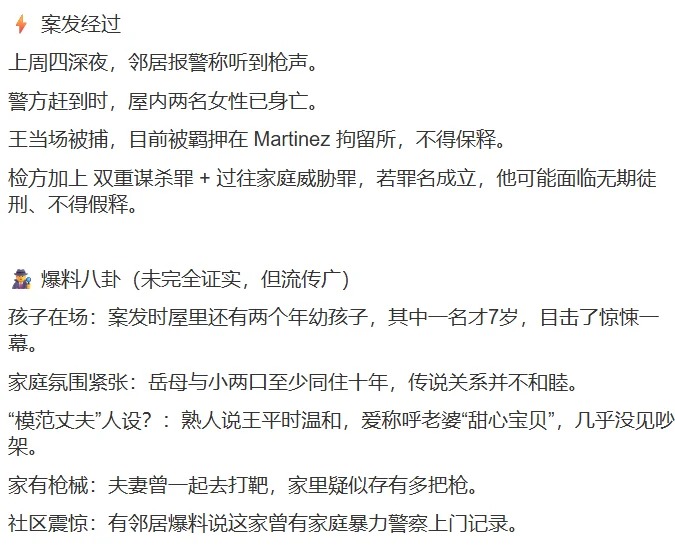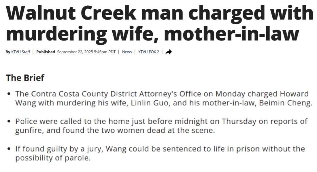 | 加州 Walnut Creek Kelobra Court 近日发生了一起令人震惊的家庭悲剧——一名 43 岁男子 Howard Wang 被指控枪杀了自己的妻子和岳母,两名女性当场身亡。 警方表示,案发时间是在周四深夜,接到报警称有人听到枪声,警员赶到住宅后,发现屋内的妻子 Linlin Guo 与岳母 Beimin Cheng 已经没有生命迹象。嫌疑人随后当场被捕,并以双重谋杀罪名被收押。 案件迅速引起社区的关注。 根据检方透露,这并不是这名男子第一次涉及家庭暴力。早在去年八月,他就因涉嫌对妻子作出“死亡及严重人身伤害威胁”而被起诉。今年一月,他又被控阻止妻子向执法部门报案。如今,这一切悲剧最终演变成两条鲜活生命的终结。 嫌疑人预计将在周三下午首次出庭接受指控。检方表示,如果最终罪名成立,他可能会面临无期徒刑且不得假释的判决。 检察官在声明中强调,这起案件是对家庭暴力危害的又一次沉痛提醒,不仅摧毁了一个家庭,也给整个社区留下了巨大的创伤。他们承诺将全力追究到底,为受害者及其家人争取公正。 Walnut Creek 一直被认为是宜居安全的东湾富裕区。社区居民表示,几十年来都很平静,“从没想过隔壁会传来枪声”。 |