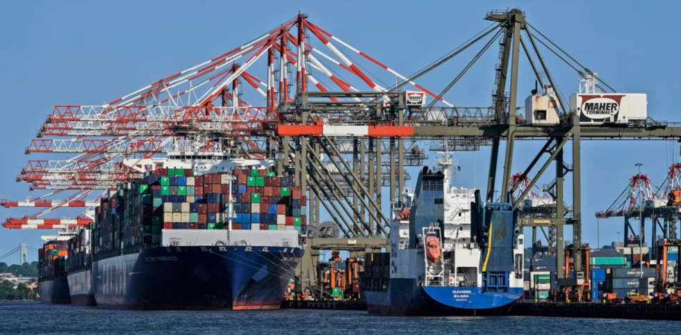 资料照:货柜停靠在美国纽约和新泽西港口。(美联社,2021年5月20日)分享