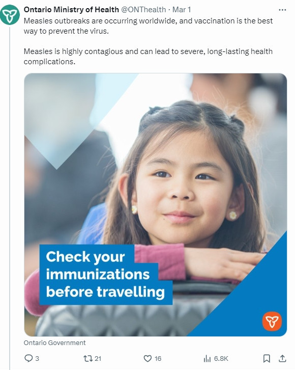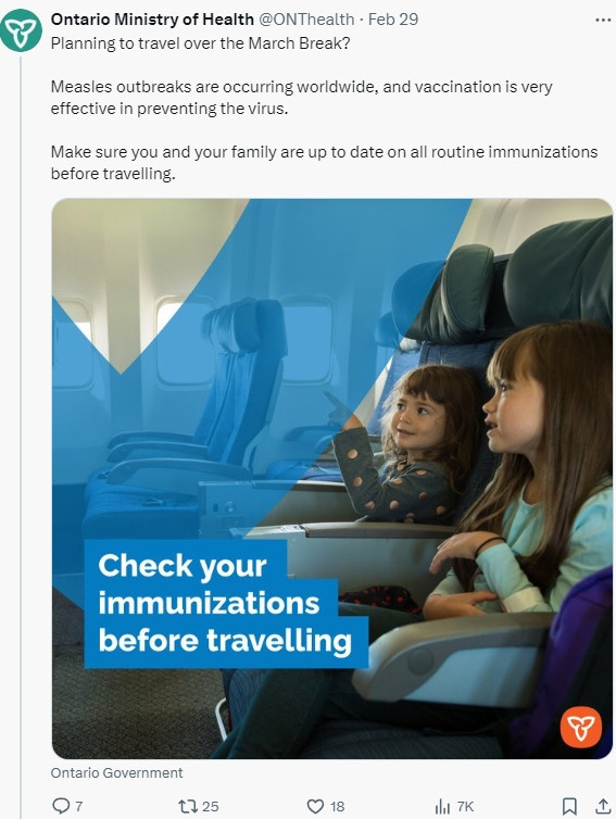 安省各地中小学校即将开启一周的春假,大批家长将带娃出游度假。鉴于目前出现的麻疹病例,安省卫生厅发布一项公告,提醒省民注意防范。 卫生厅近日在X上称,麻疹疫情正在世界范围内发生,疫苗接种是预防该病毒的最佳途径。麻疹具有高度传染性,可导致严重、长期的健康并发症。当你计划你的春假和暑假时,确保你家里的每个人都接种了麻疹和其他常规疫苗。 ![]() 图源:X@ONThealth 卫生厅在通告中称,麻疹可能很危险,尤其是对12个月以下的婴儿。麻疹病例的并发症发生率高达10%,可包括: