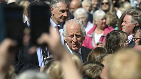 2024 年 8 月 20 日星期二,在 7 月 29 日儿童舞会上发生袭击事件后,英国国王查尔斯三世会见了当地社区成员,并在英国绍斯波特市政厅外观看了悼念活动。 (保罗·埃利斯 / 美联社泳池)