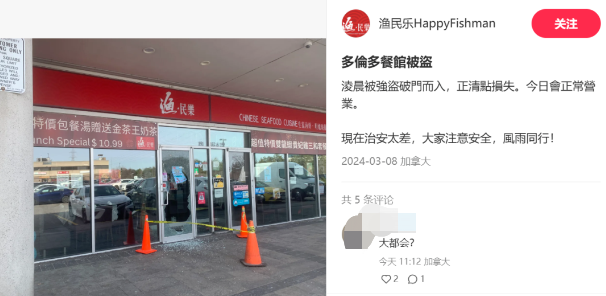 多伦多被称为犯罪之都“哥谭”,已经不是一天两天了,没想到这罪恶之手又波及到了数家华人餐馆! 51记者接到多位网友爆料,在汇聚了不少中国美食的商圈,大都会广场Metro Square,今天早上一片狼藉,停满了警车。 ![]() 图源:googlemap 在采访了几位涉事商家之后,记者了解到,抢劫案大致发生于今天凌晨,大约2:00左右。 ![]() 图源:吃香水鱼的猫 其中一位商家在小红书帖子上表示,“凌晨被强盗破门而入,正在清点损失。今日会正常营业。” “现在治安太差,大家注意安全,风雨同行!" ![]() 图源:@渔民乐HappyFishman 从照片可以看出,该店入口处的一扇玻璃门被打碎,满地都是玻璃碎片。 ![]() 图源:@渔民乐HappyFishman 另一张监控图片显示,一名身背黑色挎包的嫌疑人,正在翻柜台的收银机。右上角时间显示为,3月8日凌晨,2:48分左右。 ![]() 图源:@渔民乐HappyFishman 51记者联系了几位商家,有店主表示:“损失不大。” 还有涉事中餐厅老板,在接受采访时表示:“现在店里很忙,稍后将回应更多细节。” ![]() 图源:googlemap 51记者联系了约克区警方,警方回复说:“我可以确认,今天凌晨有三家企业被闯入。一名嫌疑人仍未归案,调查仍在进行中。” ![]() 图源:吃香水鱼的猫 据了解,大都会广场汇集了很多美食,其中多家餐馆都是小红书,常常被网友们推荐的。这次事件涉及的一些商家,也深受食客欢迎。 有网友在评论区表示:“太可恶了,改天去支持你们,你家真的物美价廉!” ![]() 对此,该商家回复说:“谢谢您的支持!每份支持都是我们坚持下去的动力!” 如今的多伦多,开餐馆不仅要考虑味道和品质了,还要时时提防被抢劫,商家们也是不容易了! |