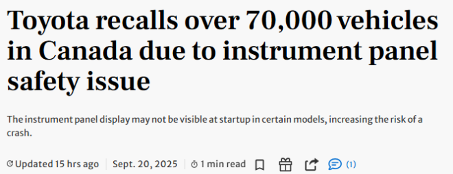 丰田在加拿大紧急召回超7万辆车 RAV4、汉兰达