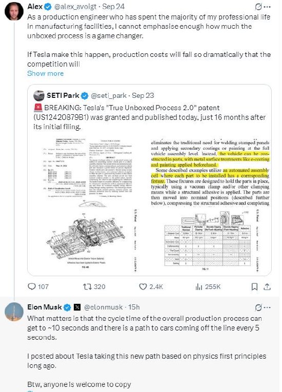 一位X用户发帖称:“特斯拉的“真正开箱式工艺2.0”(True Unboxed Process 2.0)专利已于今日(