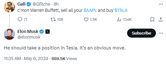 有一位用户在社交媒体平台“X”上发帖称,伯克希尔哈撒韦的老板应该卖掉所有苹果的股票,转而购买特斯拉。随后马斯克回应称,“他(巴菲特)应该持有特斯拉股票。这是一个显而易见的举动。”