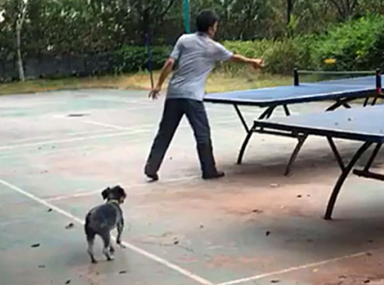 俩大爷室外打乒乓球,球落地后被狗叼跑 ...