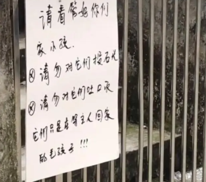 本来狗主人是觉得自己家的狗放在这里方便狗狗看家,还能解闷,栅栏也保护了周围人的安全,但是没想到这样的做法却变成一种伤害。狗主发现两次之后,在门上贴了一个提示,如图所示。