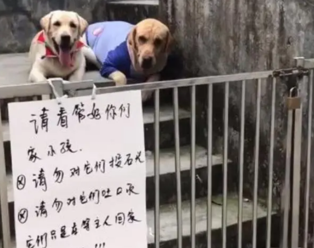 为了防止狗狗突然跑出去,也防止狗狗伤害到别人,狗主把两只狗狗放在楼梯口,并且用栅栏围住,但是没想到这样“正常”的做法,却变成了路人或者小孩们伤害狗狗的武器。