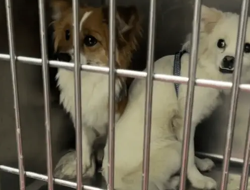 两只小狗蜷缩在笼子的角落里