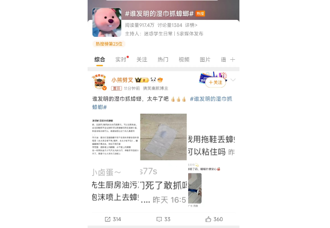 近日,一项简单却高效的灭蟑新招——“湿巾抓蟑螂法”在网络上走红,其背后的发明者更是令人意想不到。