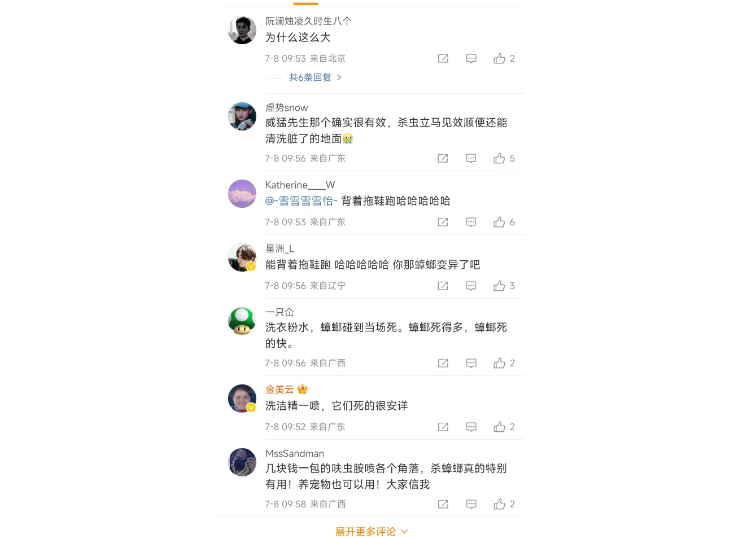 网友纷纷评论:“威猛先生那个确实很有效,杀虫立马见效顺便还能清洗脏了的地面”、“能背着拖鞋跑 哈哈哈哈哈 你那蟑螂变异了吧”、“洗衣粉水,蟑螂碰到当场死。蟑螂死得多,蟑螂死的快。”、“洗洁精一喷,它们死的很安详”、“几块钱一包的呋虫胺喷各个角落,杀蟑螂真的特别有用!养宠物也可以用!大家信我”。