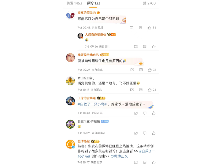 网友评论:“可能它以为自己是个羽毛球”、“能被蜘蛛网缠住也是有原因的”、“嘴角黄色的,还是个幼鸟,飞不好正常”、“好家伙~落地成盒了”。