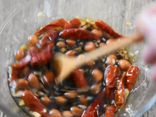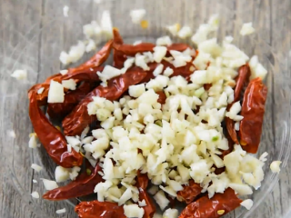 倒入辣椒干、蒜末
