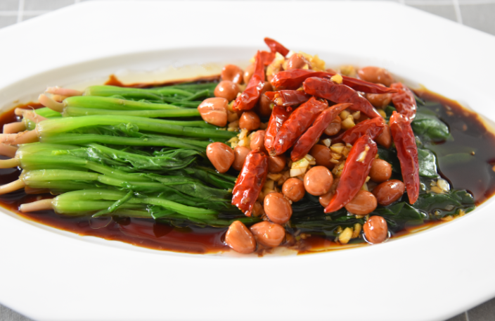 菠菜、花生、辣椒干蒜、生抽、香醋、白糖、盐备用