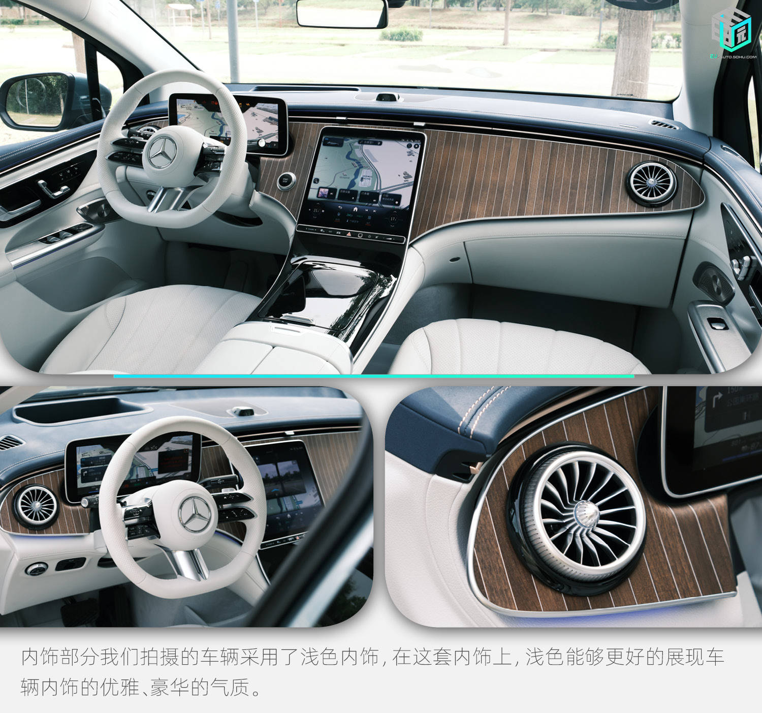 内饰部分我们拍摄的车辆采用了浅色内饰,在这套内饰上,浅色能够更好的展现车辆内饰的优雅、豪华的气质,搭配上仪表台的木纹饰板,氛围到位了。当然,顶配车型会搭载整体感及科技感更强的MBUX Hyperscreen。