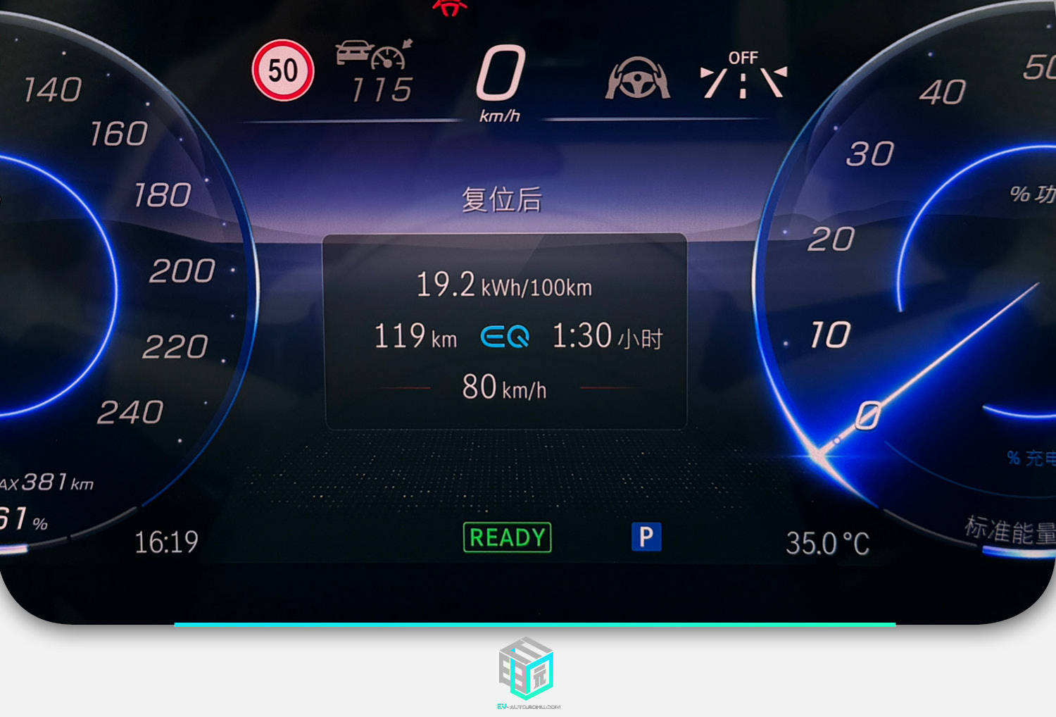 在试驾过程中,我们也记录了车辆的续航、电耗表现,在119km的高速行驶中,车辆表显平均电耗为19.2kWh/100km,从图中我们能够看到,此次行程的平均时速已经达到了80km/h,高速巡航、车内两人、空调正常开启的状况下这个电耗还是令人满意的。