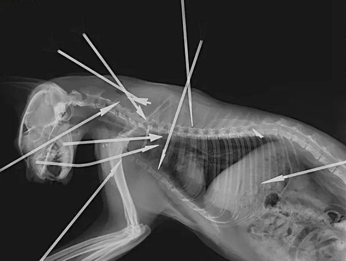 张女士提供的照片显示,狸白猫的头部、胸部和背部总共被射入9支箭,而根据X光片,还有一个断了的箭头留在猫咪体内,也就是说,狸白猫总共中了10箭。因伤势过重,最终这只猫咪抢救无效死亡。居民告诉张女士,这只猫咪在小区生活了约3年,性格温顺亲人,居民为它做了绝育、打了疫苗,没想到竟遭遇毒手。