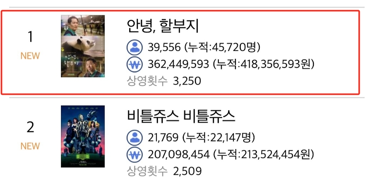 据韩联社报道,韩国电影票综合电算网5日数据,讲述旅韩大熊猫“福宝”和饲养员之间深厚情感的纪录片《再见,爷爷》前一天上映,吸引3.9万多人次观影,票房收入占比高达20.9%,登顶票房榜。
