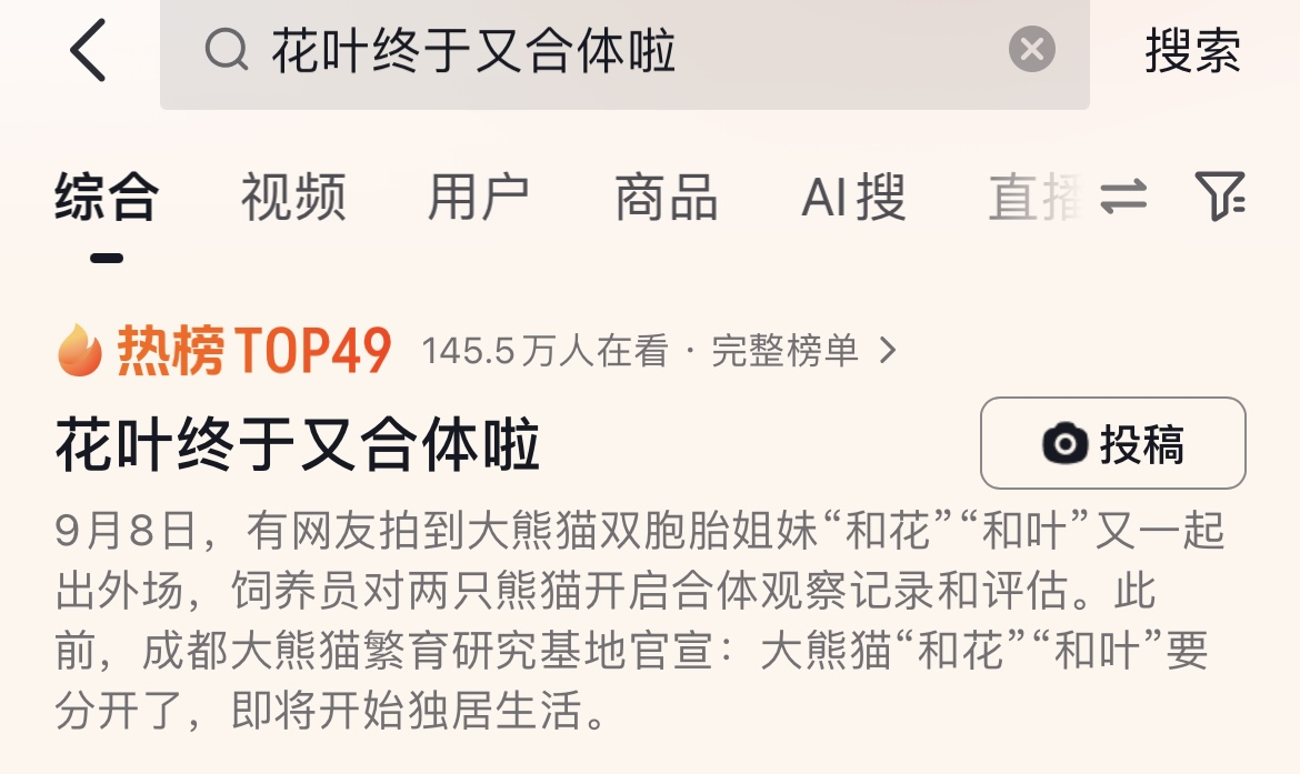 9月8日,有网友拍到大熊猫双胞胎姐妹“和花”“和叶”又一起出外场,饲养员对两只熊猫开启合体观察记录和评估。此前,成都大熊猫繁育研究基地官宣:大熊猫“和花”“和叶”要分开了,即将开始独居生活。引起了大家的关注,也冲上了热搜。