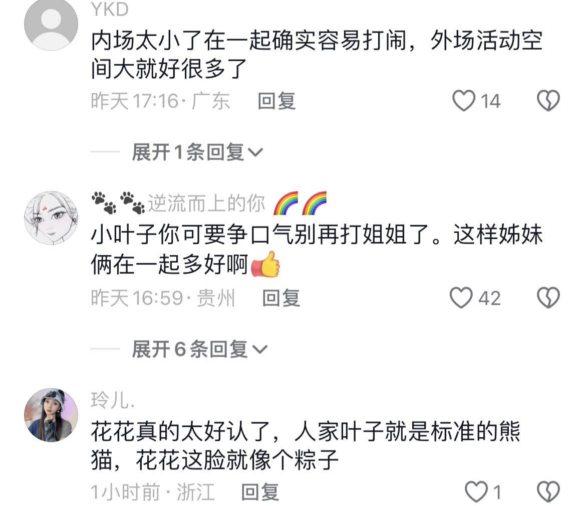 看的出来,大家对“和花”“和叶”的喜爱,大家也发表了评论,有网友说:“内场太小了,在一起确实容易打闹,外场活动空间大就好很多了”,也有网友说:“滑滑真的太好认了,人家叶子就是标准的熊猫,花花这脸就像个粽子”。