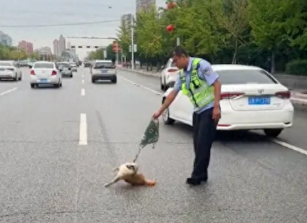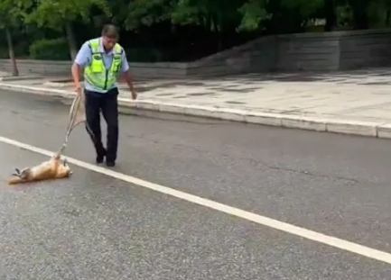 9月5日在辽宁营口,有一位网友早上去上班的时候,发现在马路上躺着一只狗狗。网友怕它被后方的车辆碾压,所以就在狗狗前面放了个三脚架。随后附近的交警发现了,想把狗狗给弄到路边。不过狗狗实在是害怕不让抱,还是公交司机拿了个座垫过来,让交警用座垫将狗狗给拖到路边来。
