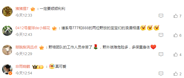 针对此事不少网友也做出了评论:其中这位网友说,谱系号777和888的两位野放的宝宝们的浪漫相遇。还有这位网友说野培团队的工作人员辛苦了,野外艰难危险多,多保重身体。