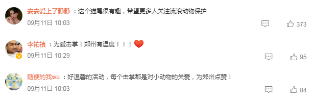 不少网友纷纷发表评论,“好温馨的活动,每个击掌都是对小动物的关爱,为郑州点赞!”“用猫尾来做守护城市流浪小动物的标志,非常有意义。要知道,城市流浪小动物最大的杀手,就是无主野猫。捕杀无主野猫,就是在保护城市流浪小动物!”