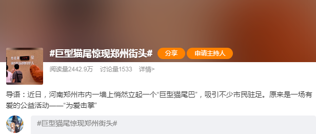 巨型猫尾惊现郑州街头,快来为爱击掌吧!