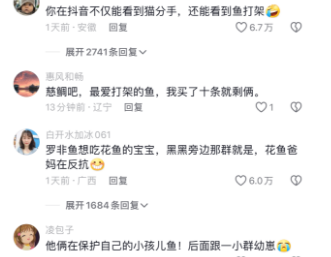 网友辣评:“你在抖音不仅能看到猫分手,还能看到鱼打架日”;“他俩在保护自己的小孩儿鱼!后面跟一小群幼崽”;“罗非鱼想吃花鱼的宝宝,黑黑旁边那群就是,花鱼爸妈在反抗”。
