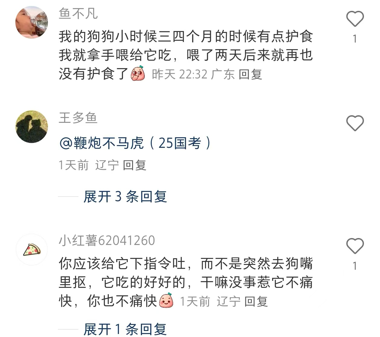 面对狗狗护食,网友们也开始支招,有网友评论:“你应该给它下指令吐,而不是突然去狗嘴里抠,它吃的好好的,干嘛没事惹它不痛快,你也不痛快”,也有网友说:“我的狗狗小时候三四个月的时候有点护食我就拿手喂给它吃,喂了两天后来就再也没有护食了”。