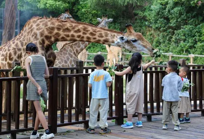 游客在上海野生动物园喂长颈鹿。
