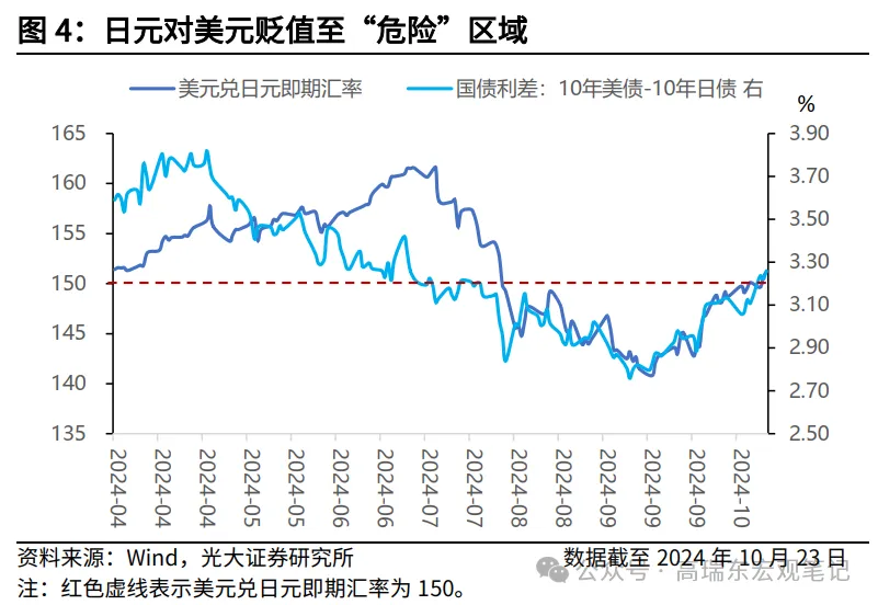 其中,日元当前已经重新对美元贬值到“危险”区间150-160,日元可能受到日本央行潜在的干预,以避免贬值预期强化,也符合日本执政党稳定政局、争取支持率的基本诉求。