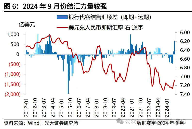暂时来看,美元兑人民币汇率7.1-7.2对应的是中性水平。向上的约束在于7.3的“天花板”,轻易不会突破。而一旦当前的人民币贬值预期有所修复,动因可能来自于美国大选结果驱动了再通胀交易的反转,那么结汇力量仍有可能推动人民币快速升值,类似于9月份人民币升值与人民币结汇相互促进。