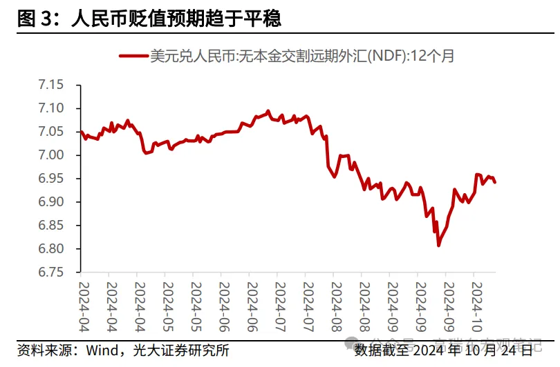 由事件驱动的人民币贬值压力已经基本释放。当前,美元兑人民币即期汇率大致围绕7.13双向波动,强美元下的人民币贬值压力已经大部分释放。从贬值预期来看,12个月NDF贬值到6.95之后小幅回调,意味着远期贬值的风险并未进一步抬升。