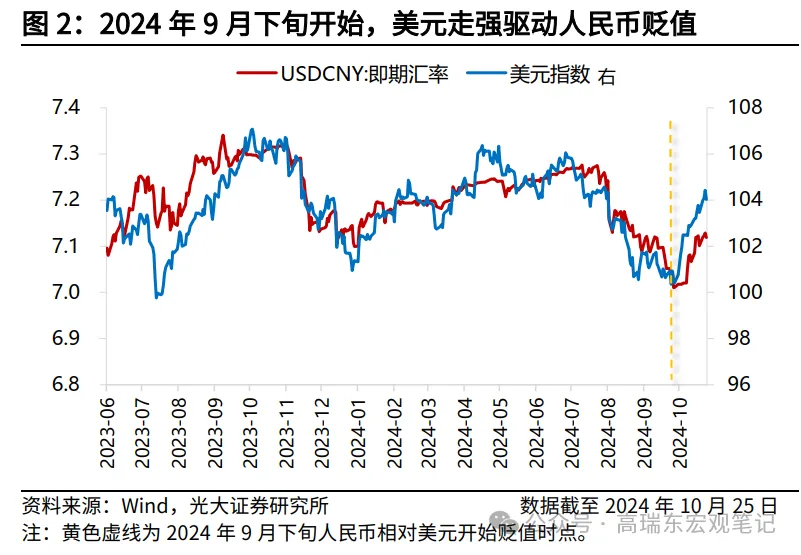 回溯来看,本轮人民币贬值最大的驱动力量来自外部。9月底美元指数见底反弹,截至10月25日,从9月下旬的低点累计反弹3.88%。人民币对美元贬值时间点与美元指数反弹时间点重合,并且随着美元走强,非美货币比如日元、欧元均走弱,美元兑日元汇率重新贬值至“危险”区间150-160,欧元兑美元贬值至1.08附近。