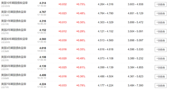 美债集体下行,10年期美债收益率上涨3个基点报4.314%。