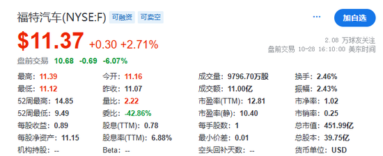 美股盘前,福特跌超6%,因成本问题和飓风干扰而下调全年EBIT预期。