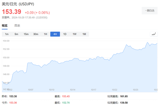 日元持续下行,美元兑日元现报153.39。