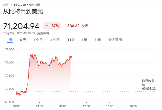 比特币涨近2%报71204.94。