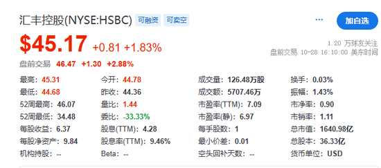 汇丰盘前涨超2%,Q3盈利超预期,宣布30亿美元股票回购计划。