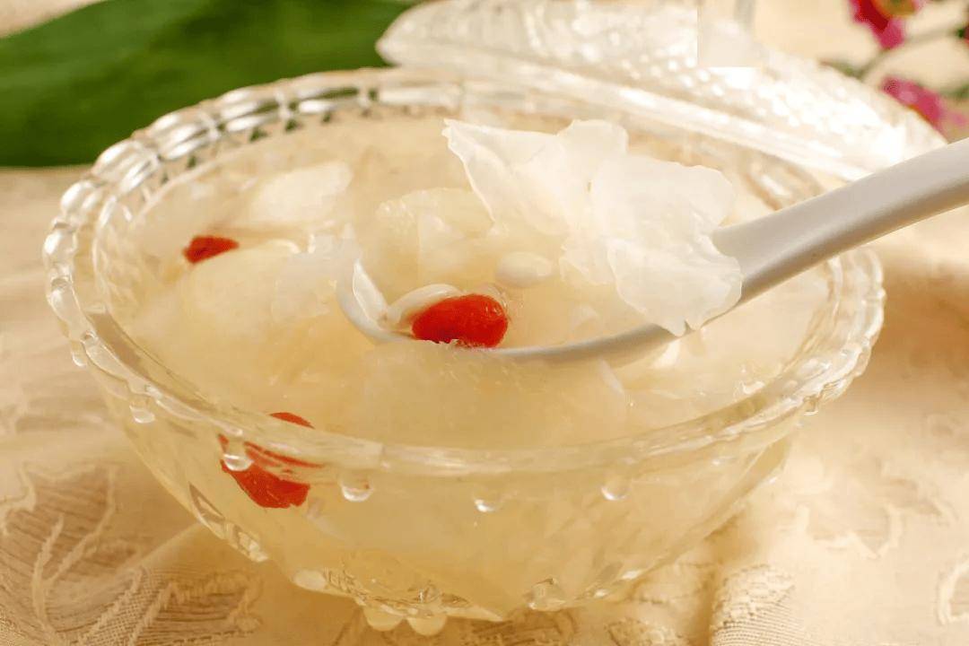 银耳泡发,去除底部硬结,撕成小块,苹果洗净去核切块。先将银耳放入锅中加入适量清水,大火煮开后转小火煮至银耳粘稠时,放入苹果块和冰糖再煮20分钟即可出锅食用。