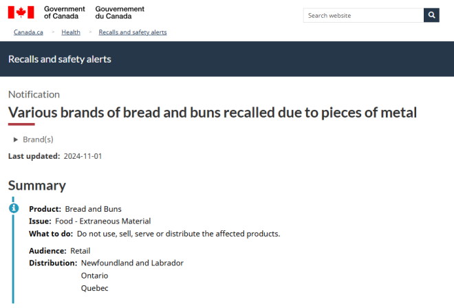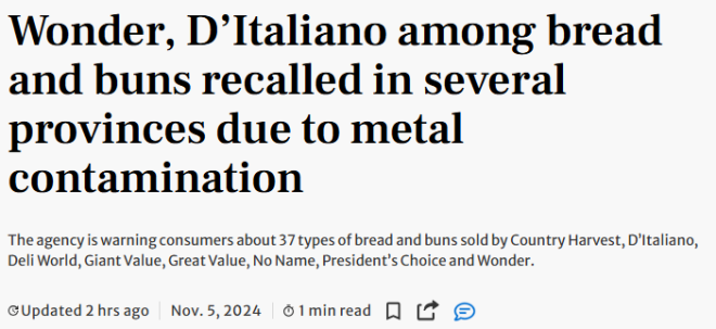 加拿大食品检验局(CFIA)已针对37款热销面包、吐司发布了召回通知,原因是这些产品中发现了金属碎片。