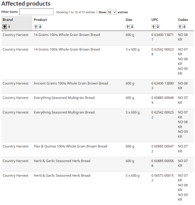 根据召回通知,受影响的产品在安省、魁省、以及纽芬兰和拉布拉多省销售。产品列表如下:
