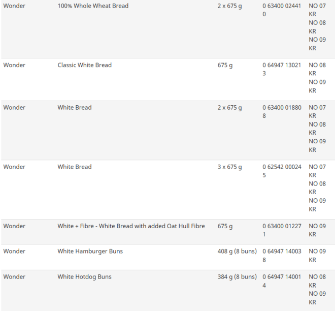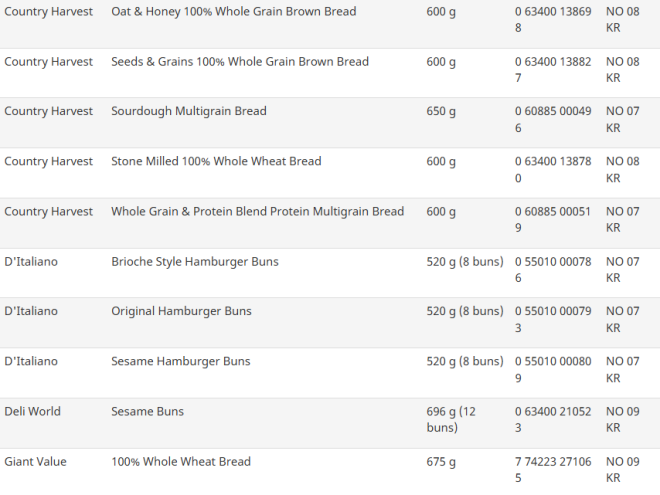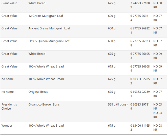 受影响的品牌包括Country Harvest、D'Italiano、Deli World、Giant Value、Great Value、No Name、President's Choice和Wonder。