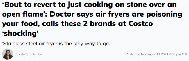 这位医生在视频中说道:“该买什么样的空气炸锅才不会毒害食物?这是个好问题,因为大多数空气炸锅的防粘涂层中含有永久化学物质,甚至可能还含有铝或塑料。”