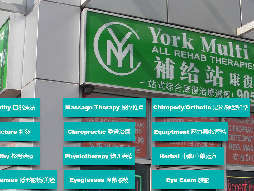 York Multi Clinic补给站足疗按摩脊椎治疗物理治疗矫形鞋垫整骨治疗针灸自然疗法York Multi Clinic补给站:接受所有医疗保险计划,公司医疗保险,学生保险,车祸保险MVA:Sunlife, Manulife, Great West Life,Green Shiedle,Blue Cross,Claim Secure, Empire Life,Standard Life,Desjardins,RBC,OTIP RAEO,Equitable life…服务项目:~精油療法Aromatherapy~~中醫穴位推拿 Tranditional Chineses Tuina~~淋巴循環按摩Lymphatic Massage~~腳底按摩Reflexology~Open Hours:Monday 10:00am – 9:00pmTuesday 10:00am – 9:00pmWednesday 10:00am – 9:00pmThursday 10:00am – 9:00pmFriday 10:00am – 9:00pmSaturday 10:00am – 9:00pmSunday 10:00am – 8:00pm一站式综合治疗选择:1.物理治疗/物理治疗2.脊椎治疗/脊骨3.骨科整骨治疗/整骨骨科整骨治疗/中医针灸杨医生治疗各种疾病:颈肩综合痛症,面瘫,牙痛,肩周炎,网球肘,腰痛,坐骨神经痛,中风后遗症,手足麻痹,各种关节炎,运动损伤,工作所致重复性肌肉劳损,头痛,偏头痛,运动,车祸损伤,肌肉扭伤韧带拉伤,肩周炎,关节炎,坐骨神经痛,手足麻痹,精神紧张,紧张性头痛,颈椎病,腰椎间盘脱出,颈肩酸痛,腰腿痛,坐骨神经痛,手足麻痹,头痛,偏头痛,运动损伤,车祸损伤,五十肩(冰冻肩),网球肘,肌筋膜疼痛症候群,肩背疼痛,韧带扭伤,肌肉拉伤,粘连性疤痕,退化性关节炎,骨折术后,人工关节置换术后等4.自然疗法/自然疗法5.针灸治疗/针灸6.注册按摩治疗/按摩疗法(RMT)7.心理咨询医生/心理学/心理治疗9.足科医生(矫型鞋垫)/ Chiropody(Orthotics)10.眼镜/隐形眼镜眼镜/隐形眼镜11.压力袜护膝护腰压缩袜/矫正器接受所有医疗保险计画:1.公司医疗保险,团体医疗险2.学生医疗保险(U of T,York,Ryerson,Waterloo,West Ontario,Seneca college,Georgian,Humber,Centennial ……)私人购买保险3.车祸意外医保(MVA),劳工意外受伤医保(WSIB)4.其他相关医疗保险,请来电咨询亦接受自费治疗一站式綜合治療選擇:1.物理治療/Physiotherapy2.脊椎治療/Chiropractic3.骨科整骨治療/Osteopathy骨科整骨治療/中醫針灸 楊醫生治疗各种疾病:颈肩综合痛症、面瘫、牙痛、肩周炎、网球肘、腰痛、坐骨神经痛、中风后遗症、手足麻痹、各种关节炎、运动损伤、工作所致重复性肌肉劳损、头痛、偏头痛、运动、车祸损伤、肌肉扭伤韧带拉伤、肩周炎、关节炎、坐骨神经痛、手足麻痹、精神紧张、紧张性头痛、颈椎病、腰椎间盘脱出、颈肩酸痛、腰腿痛、坐骨神经痛、手足麻痹、头痛、偏头痛、运动损伤、车祸损伤、五十肩(冰冻肩)、网球肘、肌筋膜疼痛症候群、肩背疼痛、韧带扭伤、肌肉拉伤、粘连性疤痕、退化性关节炎、骨折术后、人工关节置换术后等4.自然療法/Naturopathy5.針灸治療/Acupuncture6.註冊按摩治療/Massage Therapy(RMT)7.心理諮詢醫生/Psychology /Psychotherapy9.足科醫生 (矯型鞋墊)/ Chiropody (Orthotics)10.眼鏡/隱形眼鏡 Eyeglasses/Contact lenses11.壓力襪 護膝 護腰 Compression Stocking/Braces接受所有醫療保險計畫:1.公司醫療保險,團體醫療險2.學生醫療保險(U of T, York, Ryerson, Waterloo, West Ontario, Seneca college, Georgian, Humber, Centennial…..)私人購買保險3.車禍意外醫保(MVA),勞工意外受傷醫保(WSIB)4.其他相關醫療保險,請來電諮詢亦接受自費治療