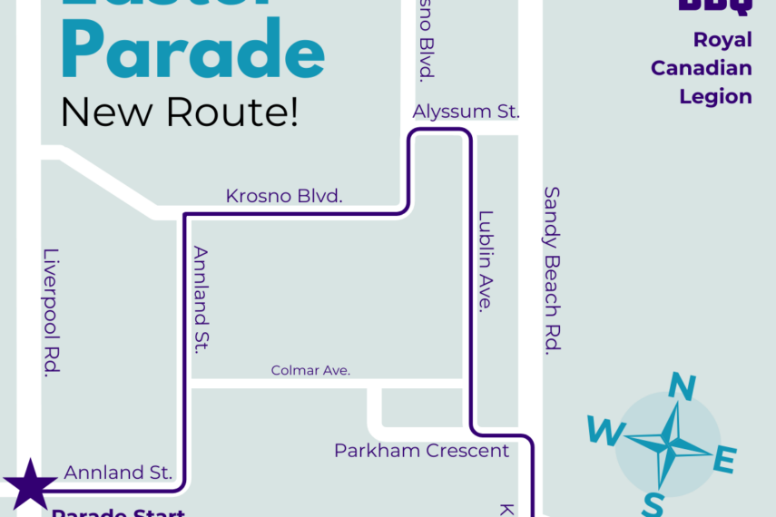 游行路线:游行从 Annland St 开始,右转上 Krosno Blbvd,然后上 Alyssum St,南上 Lublin Ave,转向 Parkham Crescent,然后前往 Sandy Beach Road,最后到达 Kinsmen Park。