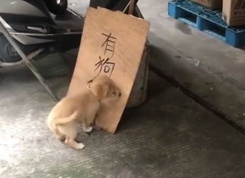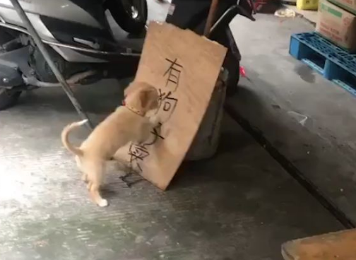 主人可能是家里狗生了小狗,也可能是不想要这个小狗来看家,就弄了个牌子,写着“有狗仔卖”...但是牌子放这之后,被拴着的小狗看到了,它就开始不停地挠“狗仔”...