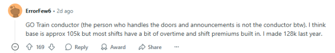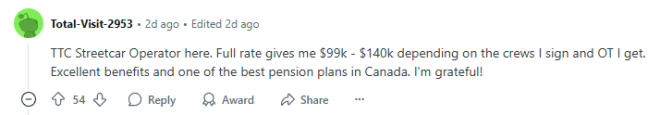 ,年薪大概在$10万到$14万之间,取决于签约的车组和加班费。(注:优秀的福利和加拿大最好的养老金计划,我很感激!)