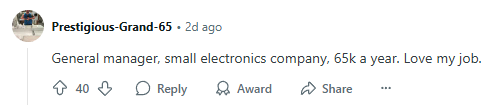 ,小型电子公司,年薪$6.5万。(注:我爱我的工作。)
