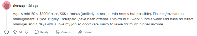 ,工作经验12年,底薪$20万,奖金5万+。(注:薪水很低于市场,以前拿过1.5倍-2倍的薪资,但是我现在每周工作30个小时,有4天在家上班,没有直接上司,很喜欢我的工作,不在乎外面更高的薪资。)